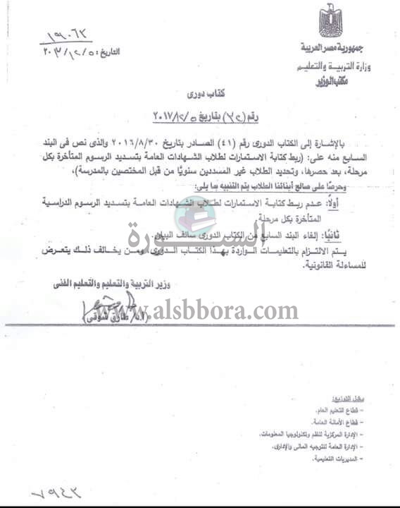 أصدرت وزارة التربية والتعليم والتعليم الفنى، كتاب دورى أكد عدم ربط كتابة الاستمارة لطلاب الشهادات العامة بسداد المصروفات الدراسية المتأخرة وإلغاء البنود الواردة فى الكتب الدورية التى تنص على ضرورة ربط كتابة الاستمارة بالمصروفات الدراسية.