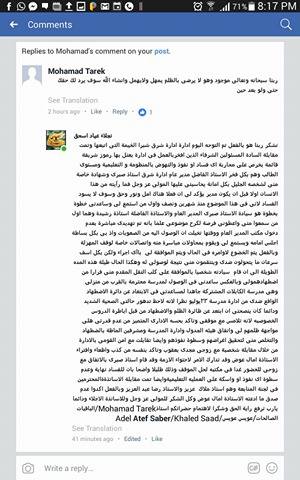 "نتقدم لسيادتكم معالى الوزير بخالص الشكر والاعتزاز لأهتمام سيادتكم البالغ بمشكلات المعلمين والتى وجهناها لسيادتكم شخصيا من خلال موقع" السبورة التعليمى" و "تيتش رايتس" وعلمنا باعطاء سيادتكم تكليفات فورية للوقوف على اسباب تلك المشكلات والعمل سريعا على حلها ومحاسبة المخطأ أو المقصر اى كان موقعه".
