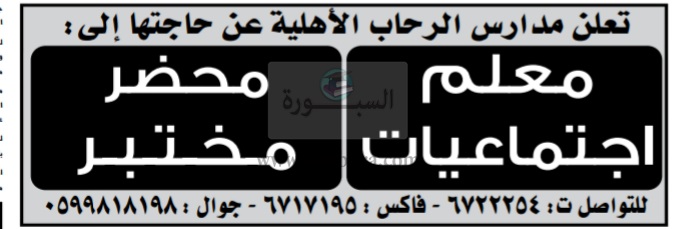 تعلن مدارس الرحاب بالسعودية عن وظائف جديدة للمعلمين وفقا للاعلان التالى