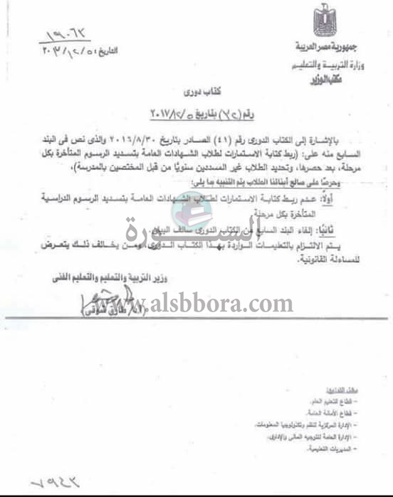 أصدرت وزارة التربية والتعليم والتعليم الفنى، كتابا دوريا هاما بشأن عدم ربط كتابة الاستمارات لطلاب الشهادات العامة بتسدسد الرسوم الدراسية المتأخرة بكل مرحلة.