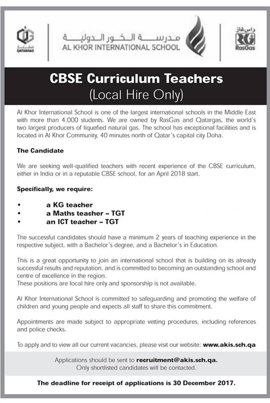 تعلن مدرسة خاصة في دولة قطر عن وظائف جديدة للمعلمين بمرتبات متميزة وذلك وفقا لنص الإعلان التالي:-