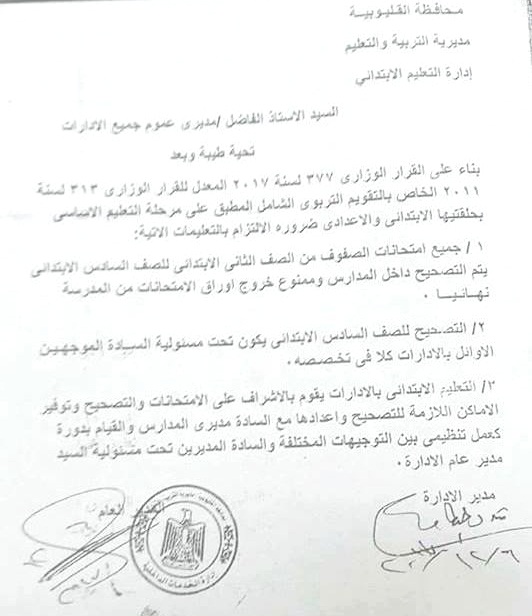 1- يتم تصحيح امتحانات الصف الثانى والثالث والرابع والخامس والسادس الابتدائى داخل المدارس ومنع خروج الاوراق من المدارسة نهائياً