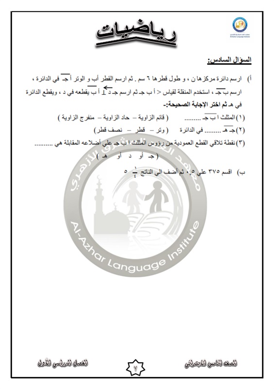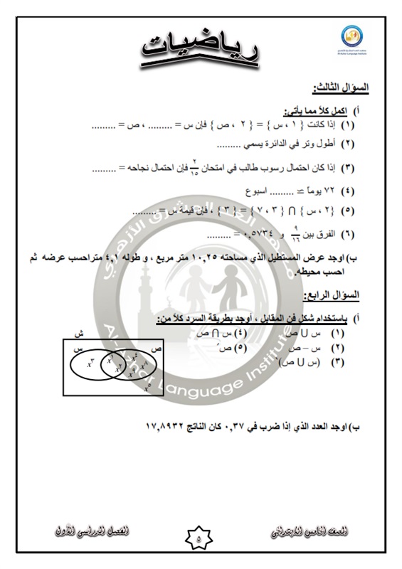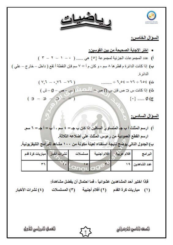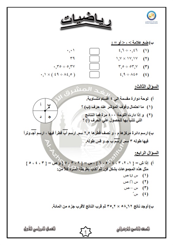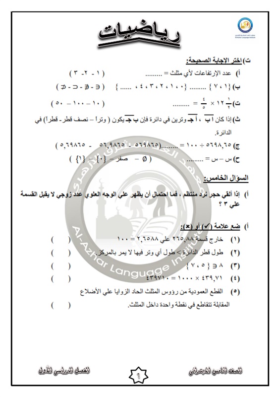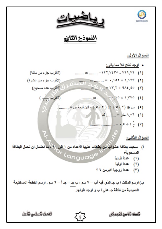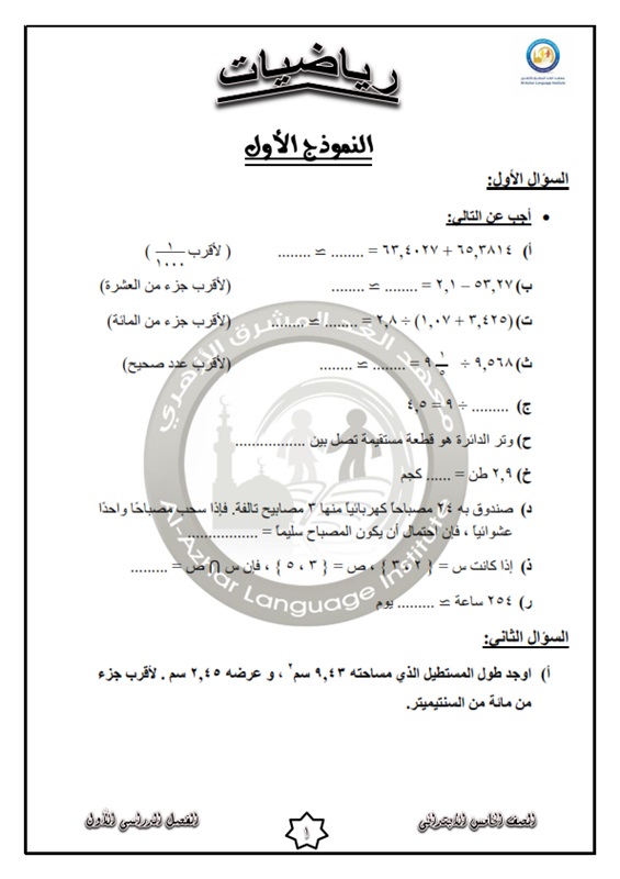 ننشر نماذج امتحانات الرياضيات للصف الخامس الابتدائى