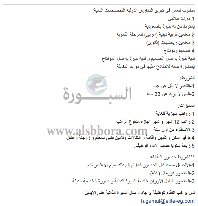 تعلن مدرسة خاصة في المملكة العربية السعودية عن وظائف جديدة للمعلمين والمعلمات بمرتبات متميزة وذلك وفقال لنص الإعلان التالي