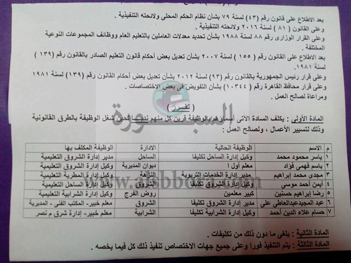 اصدرت مديرية التربية والتعليم بالقاهرة قرار بتكليف جديد لمديرى ووكلاء التعليم ووفقا لاسماء المعلنة بالقرار التالى:-