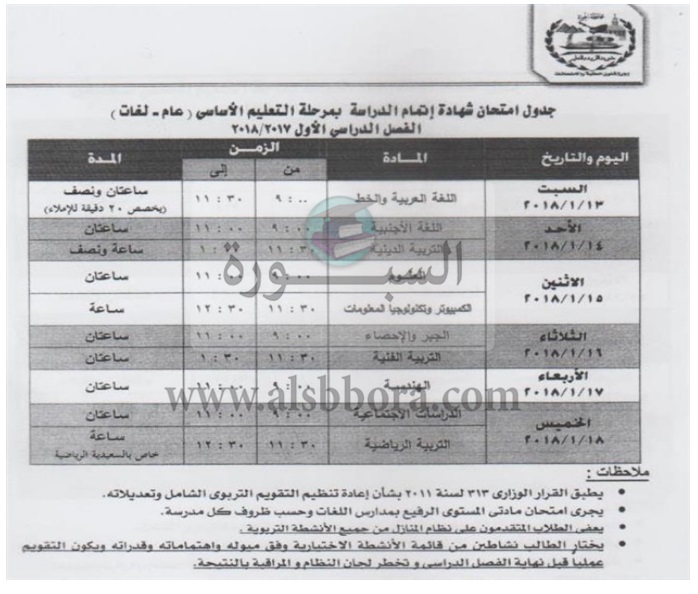 ننشر جدول امتحانات الترم الأول للشهادة الاعدادية للعام الدراسى 2018/2017