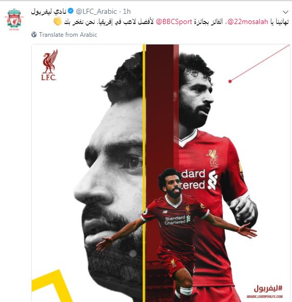 هنأ نادي ليفربول الإنجليزي،لاعبه محمد صلاح ونجم المنتخب الوطني، بعد فوزه بجائزة أفضل لاعب في أفريقيا، للعام الحالي من هيئة الإذاعة البريطانية بي بي سي.