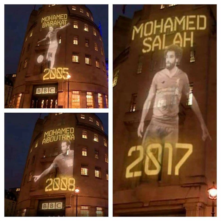 عقب اعلان هيئة الاذاعة البريطانية فوز الاعب الدولى المصرى محمد صلاح لاعب المنتخب المصرى ولاعب ليفربول الانجليزى بجائزة احسن لاعب فى افريقيا تم انارة المبنى بصورة "صلاح" الفائز بجائزة 2017
