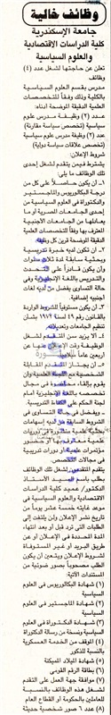 تعلن جامعة الاسكندرية عن حاجتها الى أعضاء هيئة التدريس فى 4 تخصصات، وعلى الراغبين فى التقدم الاطلاع على اعلان جريدة الجمهورية المنشور اليوم الأربعاء الموافق 13/12/5017، والذى جاء كما يلى: