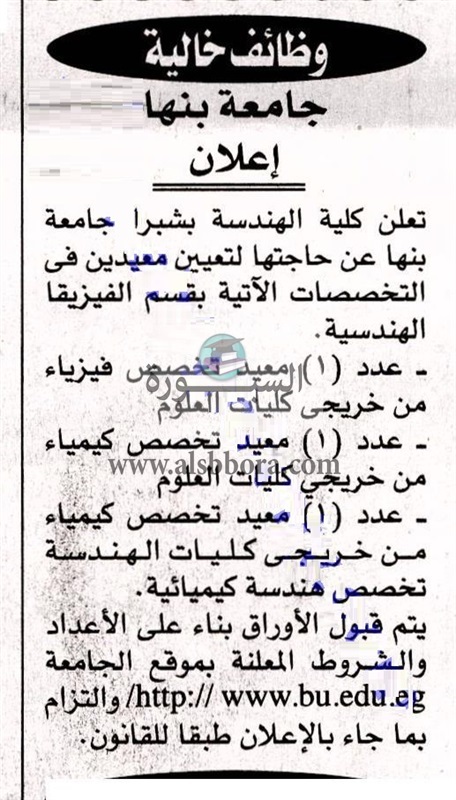 تعلن جامعة بنها عن وظائف جديدة لأعضاء هيئة التدريس "من حملة الماجستير والدكتوراه" علما بأن أخر موعد للتقديم 21 ديسمبر وفقا لنص الإعلان التالي: