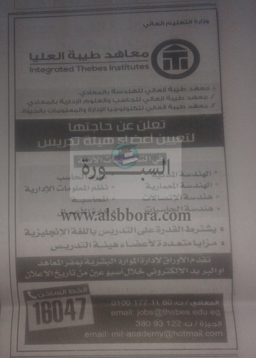 تعلن معاهد طيبة العليا عن حاجتها الى اعضاء هيئة التدريس، فى 8 تخصصات وعلى الراغبين فى التقدم تقديم الأوراق لادارة الموارد البشرية بمقر المعاهد عن طريق البريد الالكترونى خلال أسبوعين من تاريخ نشر الاعلان، والذى تم نشره فى جريدة الأهرام اليوم الجمعة الموافق 15 ديسمبر 2017.