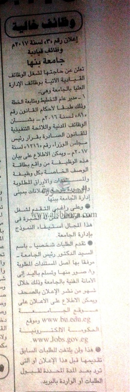 تعلن جامعة بنها عن وظائف قيادية شاغرة وعلى الراغبين فى التقدم تقديم الطلبات شخصيا باسم الدكتور رئيس الجامعة مرفقا بها اصل المستندات المطلولة و8 صور منها وتسلم باليد الى الامانة الفنية بالجامعة وذلك خلال شهر من نشر الاعلان بالصحف، ويمكن الاطلاع على الاعلان على موقع الجامعة.