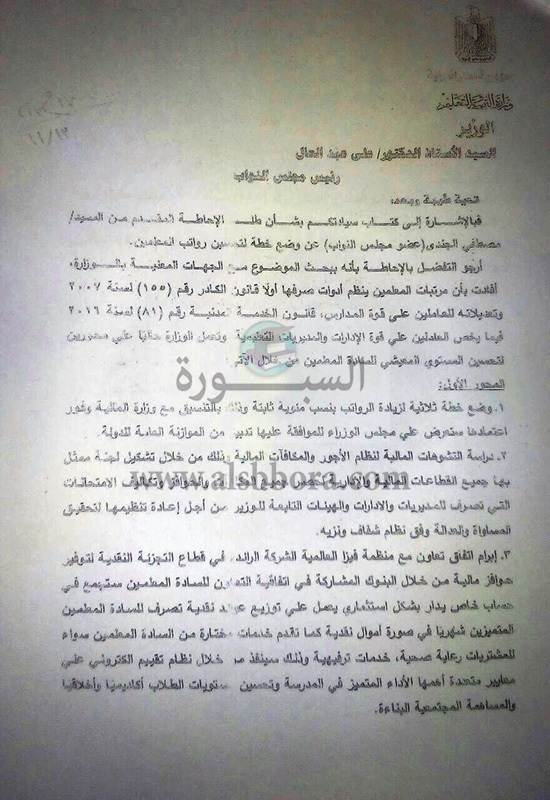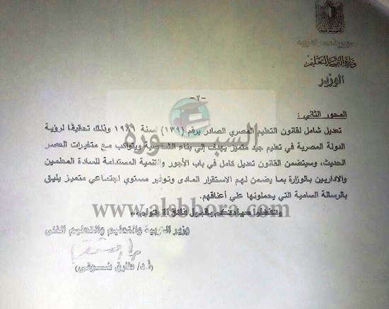 كما أفادت الوزارة، حسب البيان - بفتح ملف الأجور والمكافآت المالية من خلال حصر جميع المكافآت والحوافز وتكاليف الامتحانات التى تصرف للمديريات والإدارات والهيئات التابعة للوزير من أجل إعادة تنظيمها لتحقيق المساواة والعدل وفقا لنظام شفاف ونزيه.