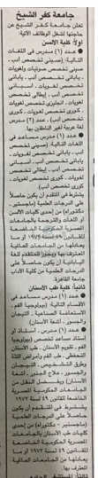 تعلن جامعة كفر الشيخ عن وظائف جديدة لأعضاء هيئة التدريس "من حملة الماجستير والدكتوراه "في مختلف كلياتها علما بأن أخر موعد للتقديم 19 ديسمبر وفقا لنص الاعلان :