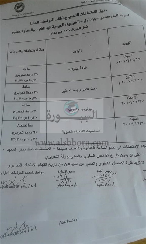 أوضح الدكتور هشام عبد الدائم عميد معهد الكبد القومى بالمنوفية ببدء امتحانات الدراسات العليا لدرجة الماجستير 2017 لقسم ابطفيلياتوالباثولوجياوالتصوير الطبى وجراحه الكبد والبنكرياس وطب الكبد والميكروبيولوجيا والم التشخصيه والجزئيه وقسم طب كبد الاطفال 23/ 12/ 2017