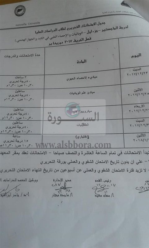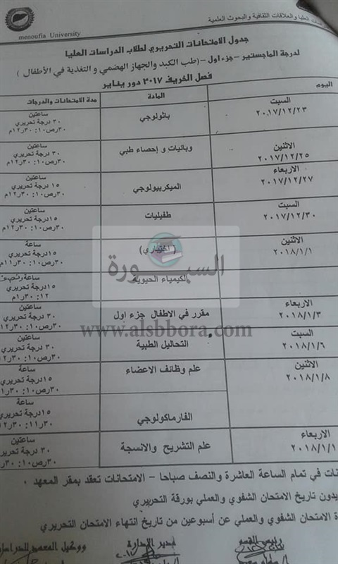 جدول امتحانات التحريرى للدراسات العليا لدرجه الماجستير حزء اول بمعهد الكبد بالمنوفية