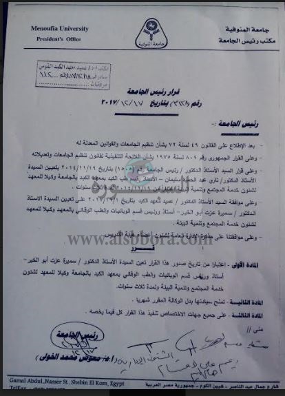 يذكر أن الدكتور هشام عبد الدائم عميد معهد الكبد القومى بالمنوفية تقدم بمذكرة لرئيس الجامعة تفيد ترشيح الدكتورة سميرة عزت وكيلا للمعهد وذلك لانتهاء فترة الدكتورة تاري.
