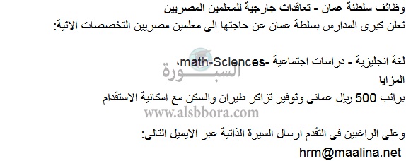 تعلن مدرسة خاصة في سلطنة عمان عن وظائف جديدة للمعلمين والمعلمات المصريين بمرتبات تصل إلي 500 ريال عماني "ما يعادل 23 ألف جنيه مصري وذلك وفقا لنص الإعلان التالي :