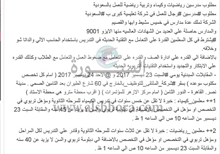 بمرتبات وبدلات تصل إلي 14 ألف ريال | السعودية تعلن عن وظائف جديدة للمعلمين والمعلمات المصريين.. ننشر نص الإعلان
