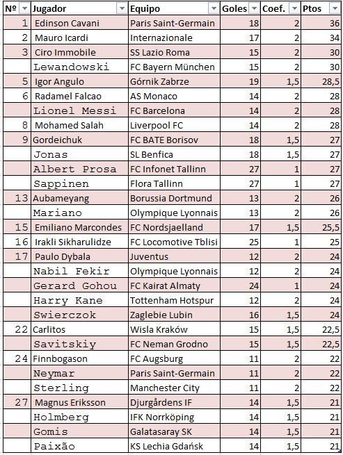 ويتصدر القائمة الأوروجوياني ايدنسون كافاني مهاجم باريس سان جيرمان الفرنسي برصيد 18 هدفا وخلفه الأرجنتيني مارو إيكاردي لاعب انترميلان الإيطالي