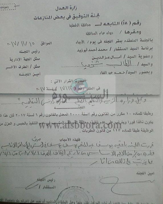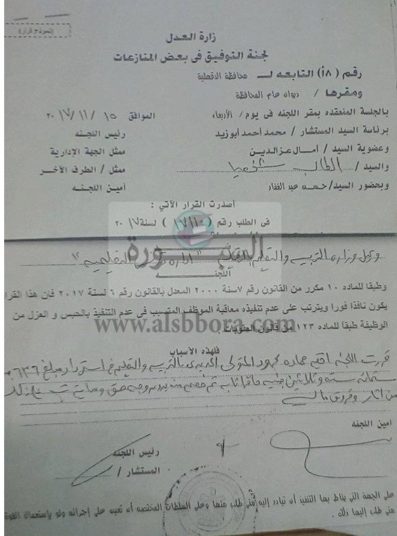 ينشر موقع السبورة قرار لجنة التوفيق في بعض المنازعات التابعة لمحافظة الدقهلية ومقرها ديوان عام المحافظة في الطلب رقم 17110 لسنة 2017م والطلب رقم 17112 لسنة 2017 م باسترداد ما تم خصمه بدون وجه حق من حافز إثابة وما يترتب على ذلك من آثار وفروق مالية.