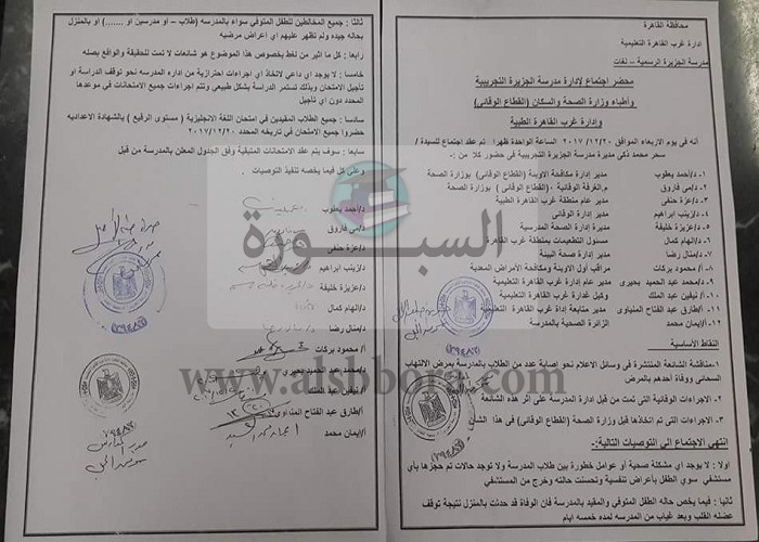 صرح اﻹعلامي أحمد خيرى المتحدث الرسمى باسم وزارة التربية والتعليم والتعليم الفني أنه بشأن ما تم تداوله فى بعض وسائل الإعلام، نحو إصابة عدد من الطلاب بمدرسة الجزيرة الرسمية التابعة ﻹدارة غرب القاهرة بمرض اﻻلتهاب السحائى، ووفاة أحد الطلاب بهذا المرض، بأنه ليس له أساس من الصحة.