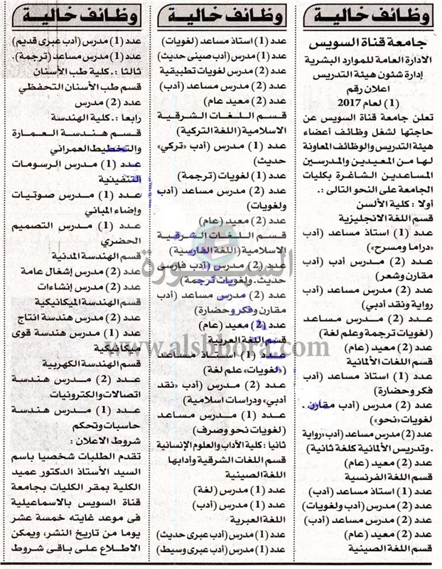 أعلنت جامعة السويس عن حاجتها الى أعضاء هيئة التدريس من المعيد الى الاستاذ فى 45 تخصصا فى 4 كليات، وعلى الراغبين فى التقدم تسليم الطلبات باليد باسم الدكتور عميد الكلية عبر الاعلان المنشور فى جريدة الأهرام.