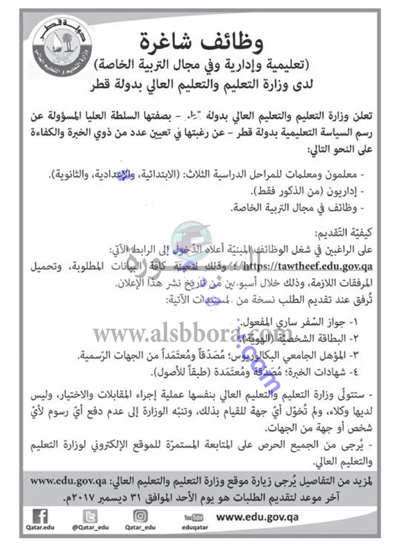 تعلن وزارة التعليم والتعليم العالى بدولة قطر عن عدد من الوظائف وذلك وفقا لنص الإعلان التالى: