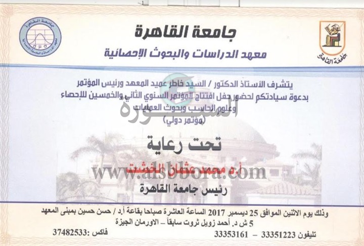 وقال الدكتور السيد خاطر عميد معهد الدراسات والبحوث الإحصائية بجامعة القاهرة ورئيس المؤتمر، أنه سيتم مناقشة العديد من االموضوعات الهامة، من خلال 10 جلسات علمية بجانب الندوات وورش العمل التى تتضمنها أعمال المؤتمر، ومن بينها المرأة المصرية وزيادة الإنجاب، والتأمين والخصوصية في شبكات التواصل الإجتماعي في ضوء احصائيات الإنترنت 2017، والمبادئ الأخلاقية المصاحبة لممارسات البحث العلمي، ودور المشاركة المجتمعية في دفع عجلة التنمية، إلى جانب مناقشة 60 بحثآ وورقة عمل فى مجالات الإحصاء التطبيقي والإقتصاد القياسي، والإحصاء الحيوي والسكاني، وعلوم الحاسب ونظم المعلومات والتى تتناول لقضايا التنمية البشرية والسكان، والتنمية المستدامة، وقضايا المرأة والطفل، ومعدلات الفقر، والبطالة، وغيرها .