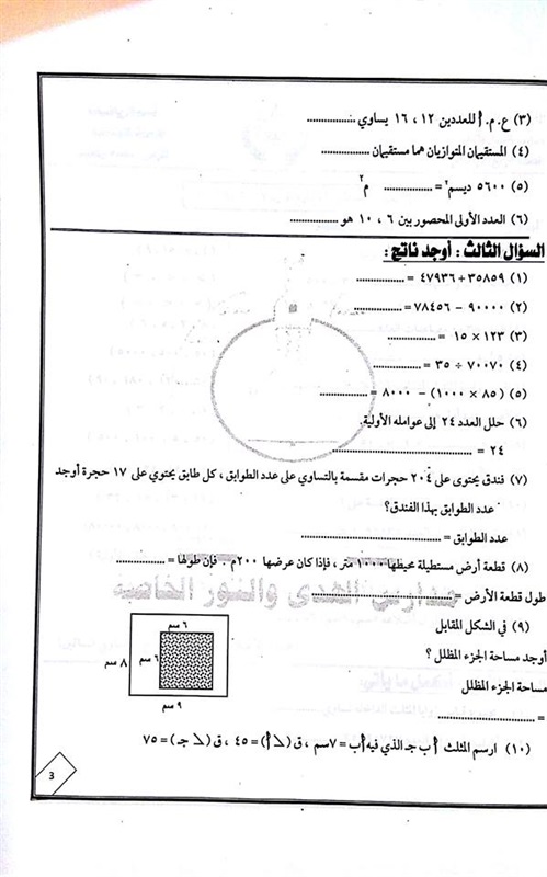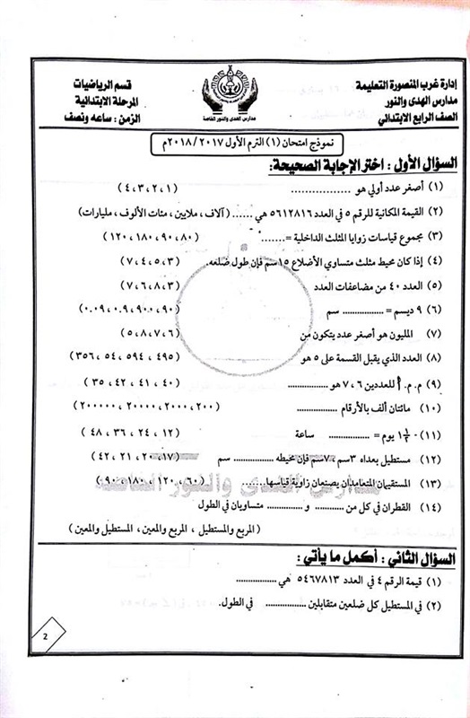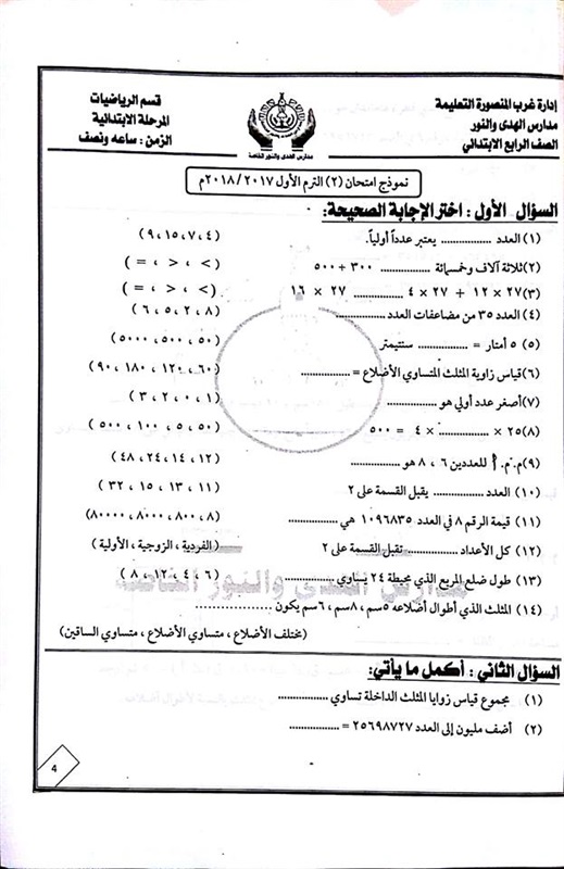 ننشر امتحان مادة الرياضيات للصف الرابع الابتدائى الترم الأول للعام الدراسى 2018/2017