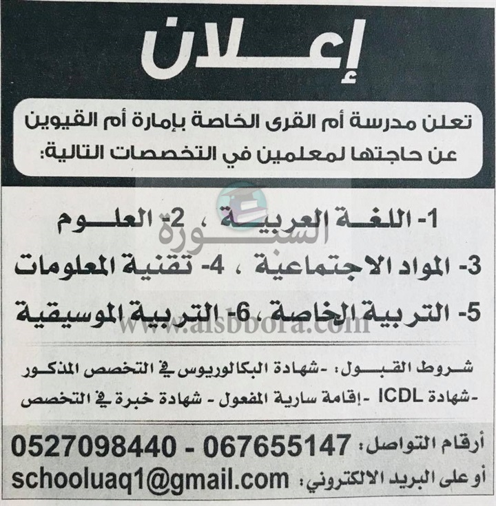 تعلن مدارس أم القري الإماراتية عن وظائف جديدة للمعلمين والمعلمات في 6 تخصصات وذلك وفقا لنص الإعلان التالي: