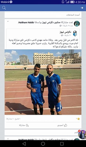 وقالت الصفحة الرسمية للنادي على موقع التواصل الاجتماعي: "لله الأمر من قبل ومن بعد.. حامد مهدي لاعب دكرنس يبتلع لسانه في مباراة ودية أمام ميت رومي ويتوفي في الحال.. يا رب صبرنا على مصيبتنا وصبر أهله".