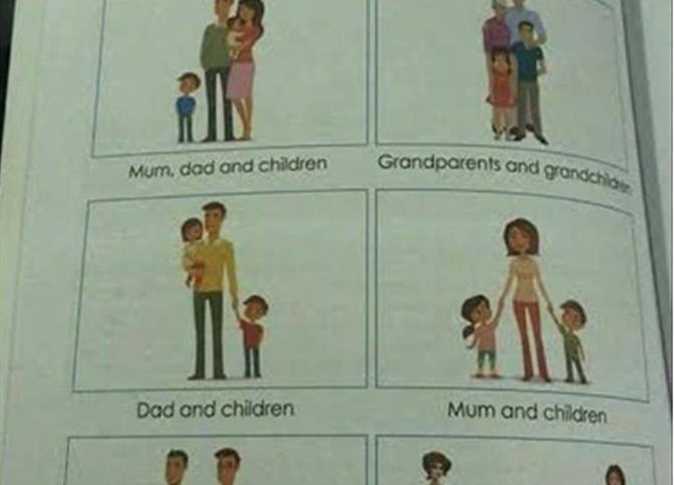 وأظهرت الصورة المتداولة 4 امثلة باللغة الانجليزية: الأولى تضم الجد والجدة والأبوين، والثانية تضم الأب والأم والأطفال، والثالثة تضم امرأتين وطفل مصحوبة بتعليق «two mums and child»، والرابعة تضم أبوين وطفل مصحوبة بتعليق«two dads and child».