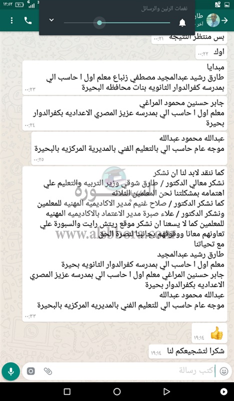 "تقدم كل من الاستاذ عبد الله محمود موجه عام مادة الحاسب الالى بالمديرية المركزية بالبحيرة والاستاذ طارق رشيد معلم اول حاسب الى بمدرسة كفر الدوار الثانوية بنات والاستاذ جابر حسنين محمود معلم اول حاسب الى بمدرسة عزيز المصرى الاعدادية بكفر الدوار محافظة البحيرة بالشكر والوفاء لمعالى الدكتور طارق شوقى وزير التربية والتعليم على اهتمامه الشخصى بمشكلتنا نحن الثلاثة واعطاء اوامر سيادته بفحصها والعمل على حلها وقد تم بالفعل الاتصال بنا اكثر من مرة للوقوف على اسباب المشكلة وابداء اقتراحات حلها وقد تم ابلاغنا بتحديد موعد مقابلة شخصية لنا جميعا بالاكاديمية وقد قمنا بها بالفعل وقد وجدنا تعاونا واهتماما كبيرا من قيادات الاكاديمية ومسئوليها فنشكرهم جميعا ونخص بالذكر الدكتور صلاح غنيم مدير الاكاديمية والدكتور علاء صبرة مدير الاعتماد".