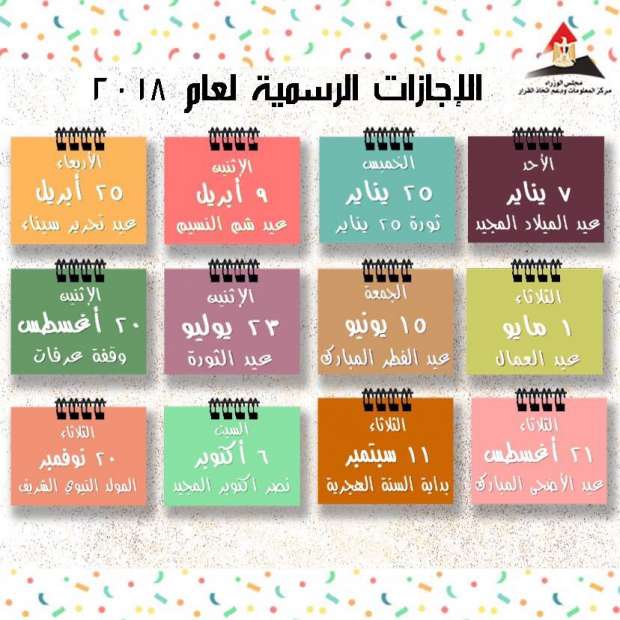 نشر مركز معلومات مجلس الوزراء، عبر صفحته الرسمية على موقع التواصل الاجتماعي "فيس بوك"؛ أجندة الإجازات الرسمية لعام 2018