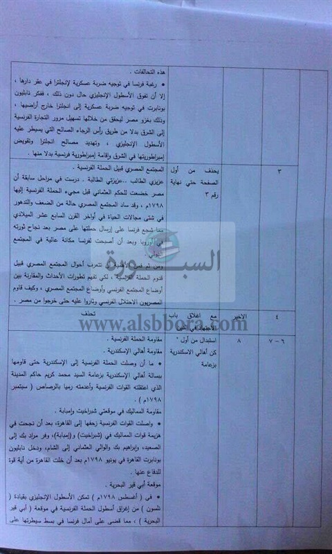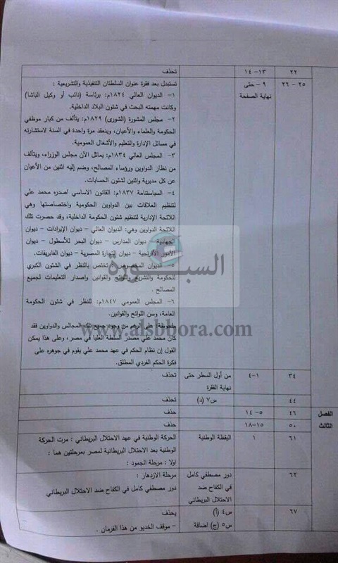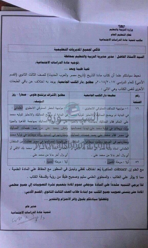 أرسلت وزارة التربية والتعليم فاكسا هاما الى جميع المعلمين والمديريات والادارات التعليمية بشأن كتاب مادة التاريخ (تاريخ مصر والعرب الحديث) للصف الثالث الثانوى القسم الأدبى للعام الدراسى 2018/2017، مطابع (دار الكتب الجامعية)، حيث يوجد به اختلاف عن باقى الطبعات الأخرى لنفس الكتاب وهى الاتى: