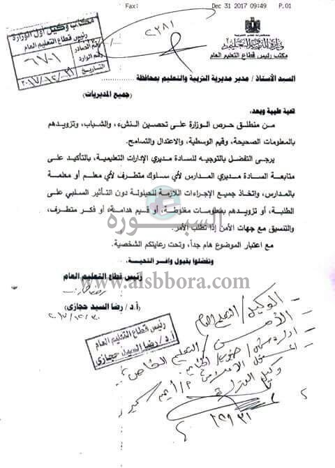 أرسلت وزارة التربية والتعليم والتعليم الفنى، فاكسا هاما الى جميع المديريات التعليمية بالتأكيد على متابقعة مديرى المدارس لأى سلوك متطرف لأى معلم أو معلمة بالمدارس، واتخاذ جميع الاجراءات اللازمة للحيلولة دون التأثير السلبى على الطلبة أو تزويدهم بمعلومات مغلوطة أو قيم هدامة أو فكر متطرف.. والتنسيق مع جهات الأمن إذا تطلب الأمر، مع اعتبار الموضوع هام جدا وتحت رعايتكم الشخصية.