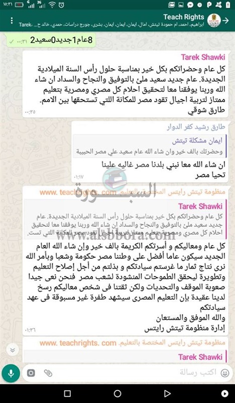 هنأ شوقى المعلمون بالعام الميلادى الجديد.. عبر جروب واتس تيتش رايتس.. واصفا القائمين عليه بجنود تطوير التعليم!!