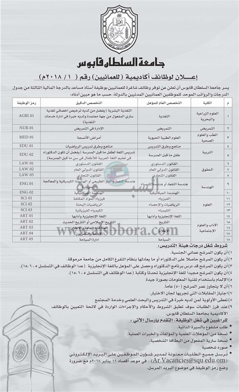 تعلن جامعة السلطان قابوس عن وظائف جديدة لأعضاء هيئة التدريس في 8 كليات وذلك وفقا لنص الإعلان التالي:-