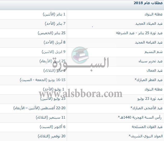 ينشر موقع السبورة الاجازات الرسمية لجميع البنوك لعام 2018