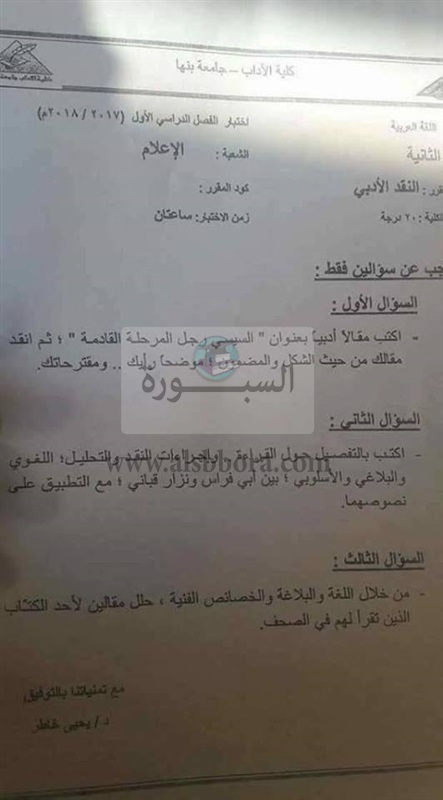 لا تزال أصداء امتحان اللغة العربية لطلبة الإعلام بكلية الآداب جامعة بنها والذي تضمن سؤالا عن كتابة مقال أدبي بعنوان "السيسي رجل المرحلة القادمة "ثم انقد مقالك" تترد مع اقتراب موعد الانتخابات الرئاسية المقبلة ولإصرار الدولة علي منع السياسة داخل الحرم الجامعي حرصا علي أن تبقي الجامعة محرابا للعلم وبعيدة أن أي تجازبات سياسية