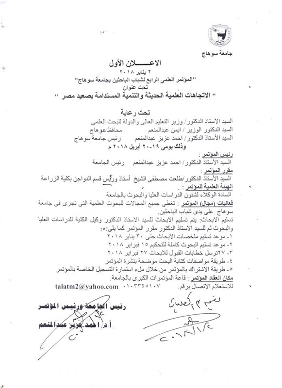 تعقد جامعة سوهاج المؤتمر العلمى الرابع لشباب الباحثين فى الفترة من 19حتى20ابريل 2018 لمدة يومين بعنوان "الاتجاهات الحديثة والتنمية المستدامة"، وذلك تحت رعاية الدكتور احمد عزيز رئيس الجامعة، والدكتور طلعت مصطفي الشيخ، رئيس قسم إنتاج الدواجن بكلية الزراعة ومقرر المؤتمر.