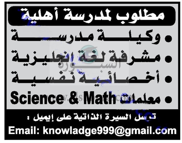 تعلن مدرسة أهلية بالمملكة العربية السعودية عن حاجتها الى وكيلة مدرسة ومشرفة لغة انجليزية واخصائية نفسية، وعلى الراغبين فى التقدم ارسال السيرة الذاتية عبر الايميل المنشور فى الاعلان التالى: