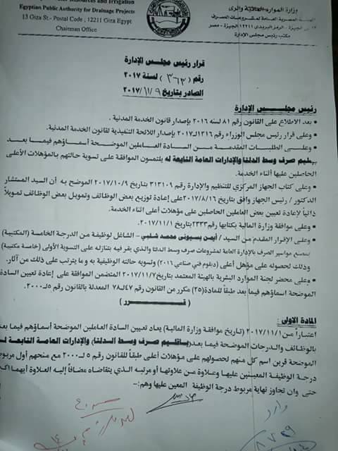 لمشروعات الصرف بمحافظة الجيزة التابعة لوزارة الموارد المائية والرى قرارها الذى حمل