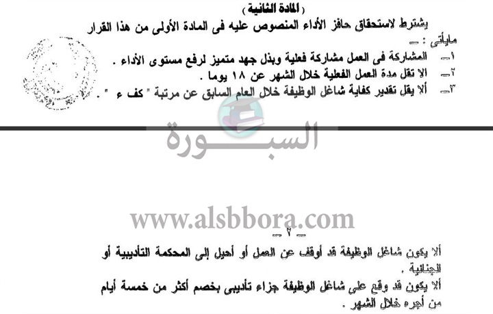 ثانيا المادة الثانية من قرار مجلس الوزراء رقم 1024 لسنة 2011 تحدد شروط صرف حافز الآداء والذى جاء كما يلى: المشاركة فى العمل مشاركة فعلية وبذل جهد متميز لرفع مستوى الآداء.