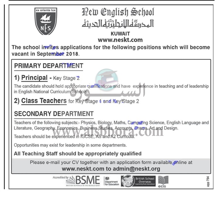 تعلن المدرسة الانجليزية الحديثة بالكويت عن وظائف جديدة للمعلمين والمعلمات وذلك وفقا لنص الإعلان التالي: