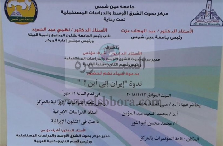 ينظم مركز بحوث الشرق الأوسط بجامعة عين شمس ندوة بعنوان "ايران الي اين"، وذلك تحت رعاية عبد الوهاب عزت رئيس الجامعة،نظمي عبد الحميد نائب رئيس الجامعة لشئون خدمة المجتمع و تنمية البيئة ورئيس مجلس إدارة المركز، وذلك في تمام الثانية عشر من ظهر السبت الموافق 13 من يناير الجاري بقاعة مؤتمرات المركز، صرح بذلك اشرف مؤنس مدير المركز.
