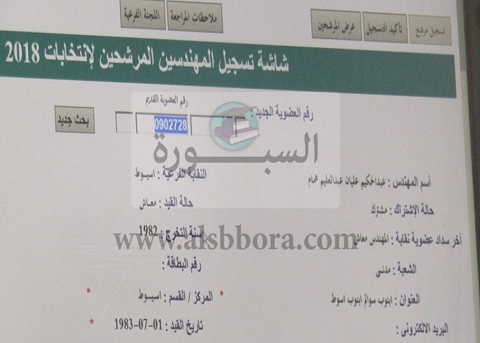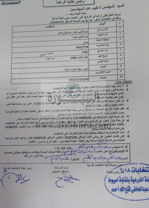 تقدم المهندس عبد الحكيم عليان عبد العليم نقيب المهندسين بأسيوط، بأوراق ترشحه على مقعد النقيب الفرعي، كما تقدم المهندس الهيثم عبد الحميد سلطان أمين عام النقابة الفرعية بأسيوط، والمهندس أحمد خليل منسق لجنة الشباب والرياضة بمجلس إدارة النقابة، بأوراق ترشحهما كأعضاء مجلس إدارة.