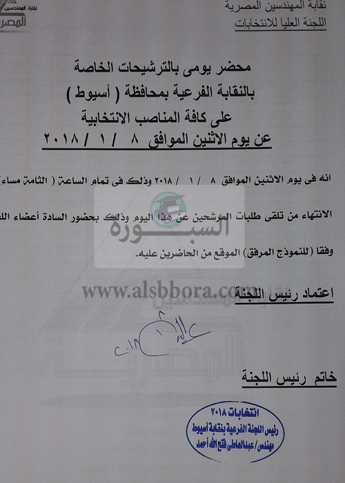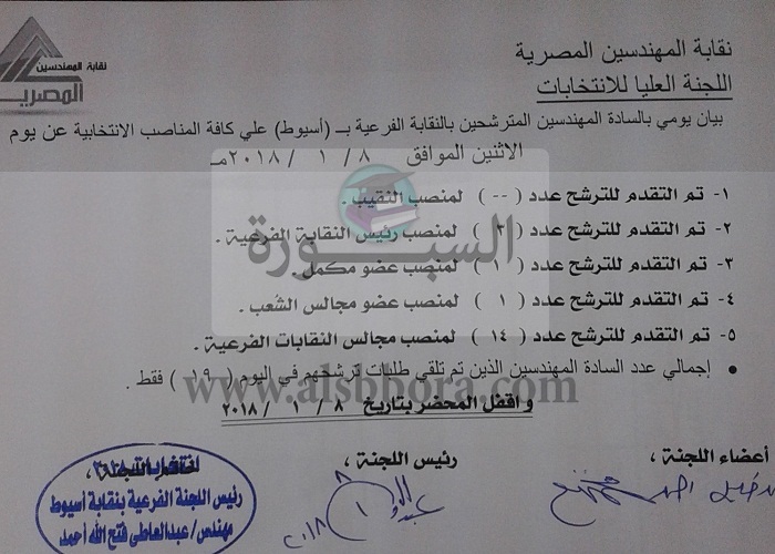 وأكد المهندس عبد العاطي فتح الله عليوة، رئيس لجنة انتخابات نقابة المهندسين بأسيوط أن اللجنة استقبلت بالأمس 19 مرشحًا، ليمثلوا المراكز الانتخابية المتاحة باستثناء منصب نقيب عام المهندسين، فلم يتقدم أحد للترشح على ذلك المقعد حتى الآن، وأن اللجنة أرسلت كشفًا بالمرشحين في اليوم الأول للنقابة العامة.