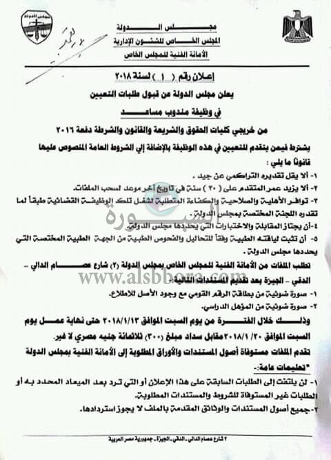 يعلن مجلس الدولة عن قبول طلبات تعيين فى وظيفة مندوب مساعد من خريجى كليات الحقوق والشريعة والقانون والشرطة دفعة 2016، على أن يشترط فيما يتقدم للتعيين فى هذه الوظيفة بالاضافة الى الشروط العامة المنصوص عليها قانونا ما يلى: